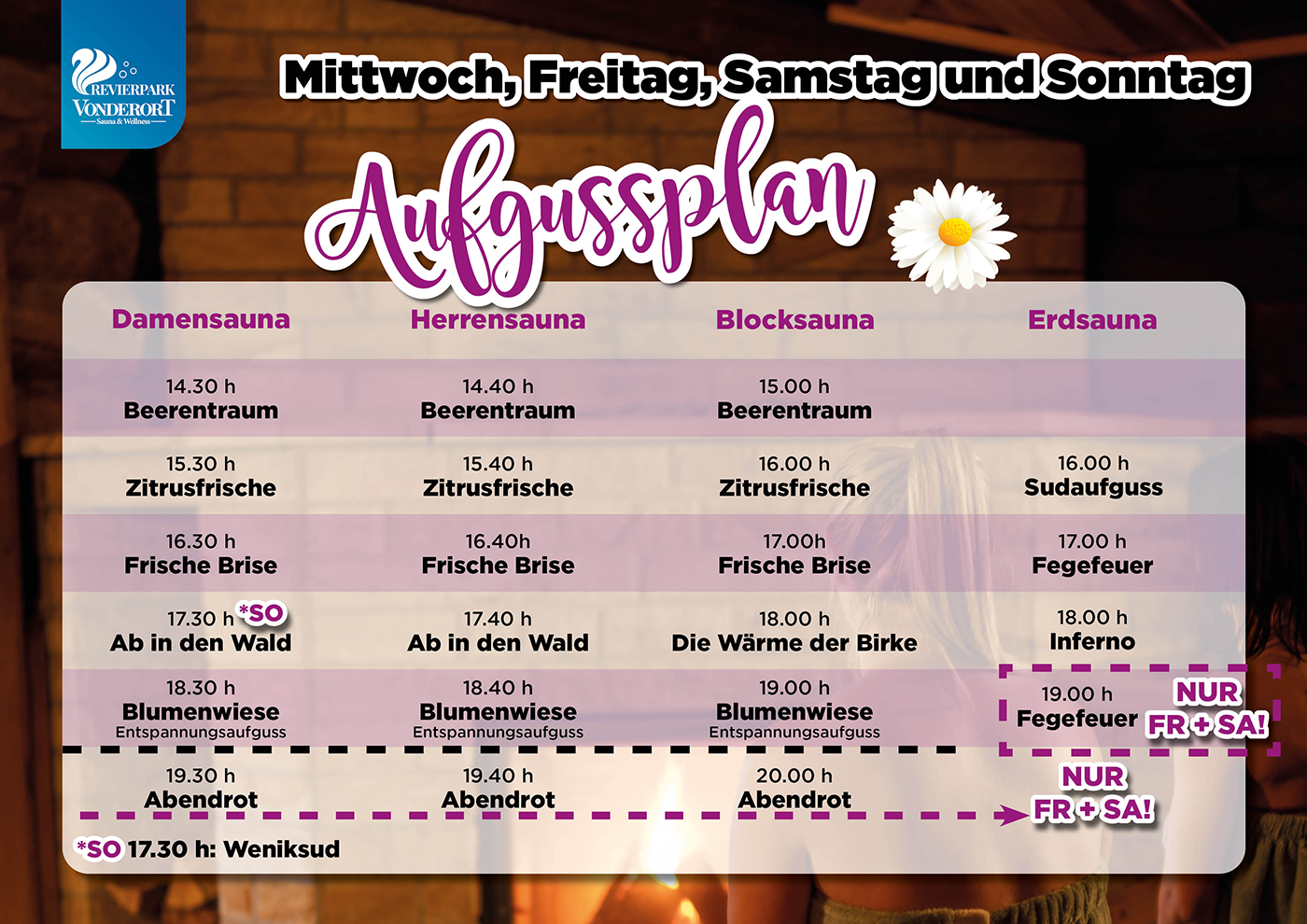 Freut euch auf eine tolle Zeit mit großartigen neuen Specials wie Dampfzeremonien, Duftreisen, doppelt so vielen Wenik-Aufgüssen und besonderen Verteilaktionen!