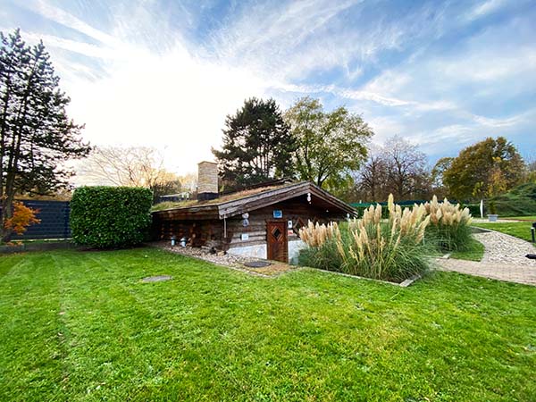 Ebenfalls im Saunagarten liegt diese urige Sauna mit dem heimeligen Kamin. Hier finden auch tiefenwirksame Klangschalen-Zeremonien statt.