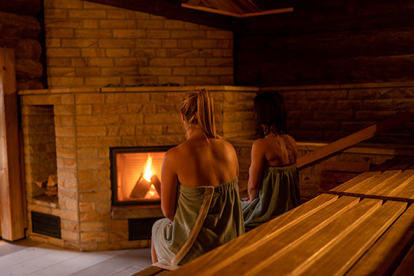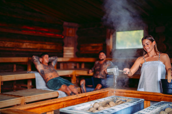 In der traditionellen finnischen Sauna entspannst Du Dich bei einer Temperatur von 85–90°C bei sehr hoher Luftfeuchtigkeit, die durch Wasseraufgüsse verstärkt wird.